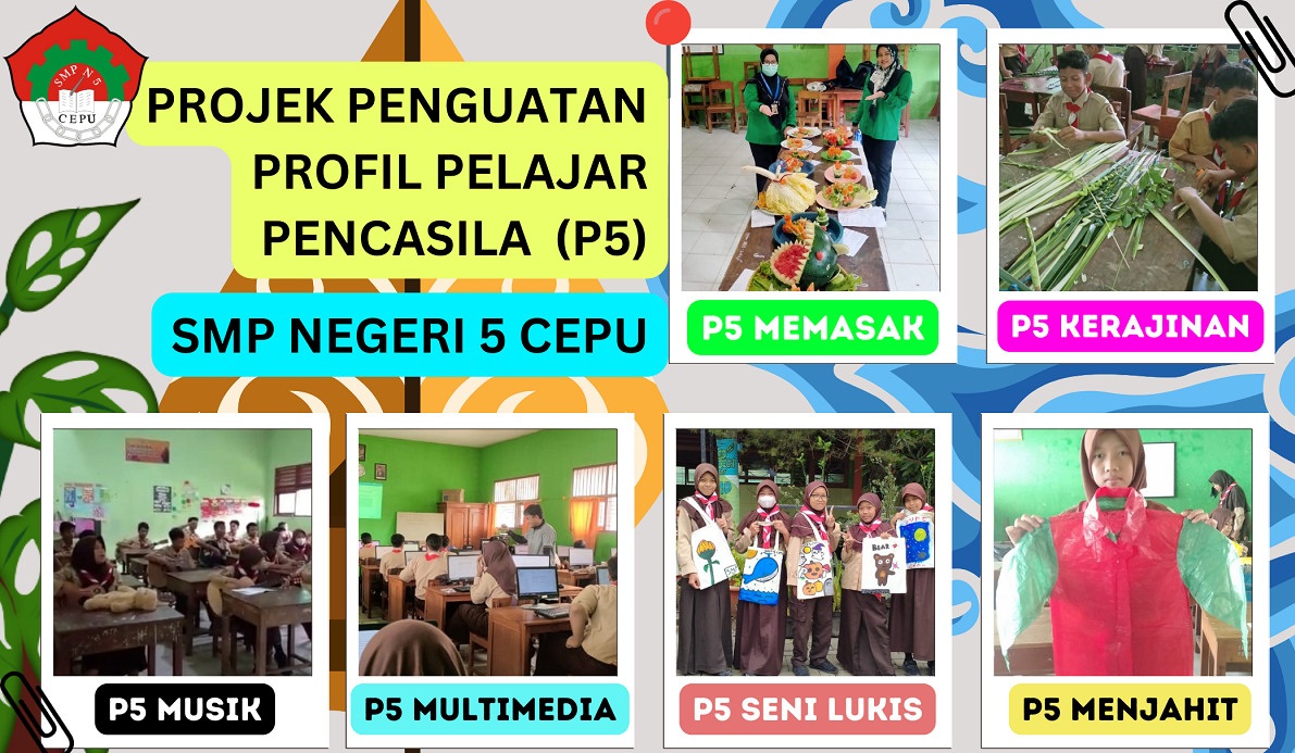 SMP NEGERI 5 CEPU mulai mengimplementasikan Kurikulum merdeka pada tahun ajaran 2022-2023. Salah satu bagian yang tidak dapat dipisahkan dari kurikulum merdeka adalah kegiatan berbasis projek, yaitu Proyek Pengembangan Profil Pelajar Pancasila atau yang kita kenal dengan sebutan (P5). Berdasarkan Permendikbud Ristek No. 56/M/2022, Projek Penguatan Profil Pelajar Pancasila (P5) merupakan kegiatan kokurikuler berbasis projek yang dirancang menguatkan upaya pencapaian kompetensi dan karakter sesuai dengan profil pelajar Pancasila yang disusun berdasarkan Standar Kompetensi Lulusan.